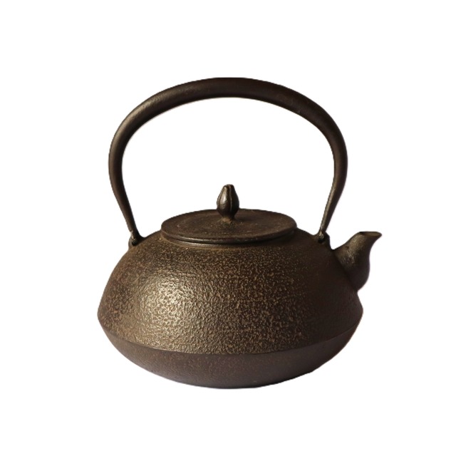 焼型製鉄瓶(鋳鉄) 中は釜焼きの金気止め 着色方法 焼き付け漆塗 色 錆色(茶) 幅 約180mm 高さ約195mm(鉉含む) 容量約1.2L 重量約1.8㎏ 及鉄鋳造所宝鉄堂 伝統工芸士 及川栄喜作 伝統の技が生み出した、平丸形ちりめん肌鉄瓶 平丸形ちりめん肌鉄瓶は、奥州藤原氏から900年前から続く伝統的製法の焼型によって手作りされた特別な鉄瓶です。炭火で焼き付けられた漆塗りが施され、独自のちりめん肌の質感を生み出しています。蓋の摘みはちりめんの花のつぼみを模しており、細部にまでこだわりが感じられる逸品です。制作は日展作家かつ伝統工芸士の及川栄喜氏によるもので、侘び寂を感じ、どの角度から見ても美しさを兼ね備えています。日常のお茶の時間だけでなく、大切な方への贈り物としても喜ばれることでしょう。 ■カラー/サイズ/バリエーション ・カラー: 錆色 ・サイズ: 幅約180mm、高さ約195mm(詳細は商品情報をご確認ください) ・容量: 約1.2L ■素材/製造国 ・素材: 鉄 ・製造国: 日本(岩手奥州市) ■お手入れ/取り扱い注意事項 ・使用後は湿気を避け、内側は水分をしっかり取り除き、外側は乾いた布で軽く拭いて保管してください。 ・錆が出来たら洗剤や金たわしは使用せず、お湯が金気臭く無ければそのまま使用する事をお勧めします。 ■発送・注文に関する情報や注意事項 ・ご注文後、通常○○日以内に発送いたします。 ・在庫の状況によっては、別途ご連絡させていただく場合がございますのでご了承ください。 ・商品に欠陥がある場合は対応致しますのでお問合せ下さい。 ■その他の情報や注意事項 ・手作りの為、サイズや色合いに若干の個体差がございます。 ・商品をお使い中に不具合が有りましたらお問合せ下さい、状況により対応いたします。 平丸形ちりめん肌鉄瓶が、あなたの生活に温かみをもたらすことを願っています。商品の詳細やご質問がございましたら、どうぞお気軽にお問い合わせください。素敵なお茶の時間をお楽しみください。
