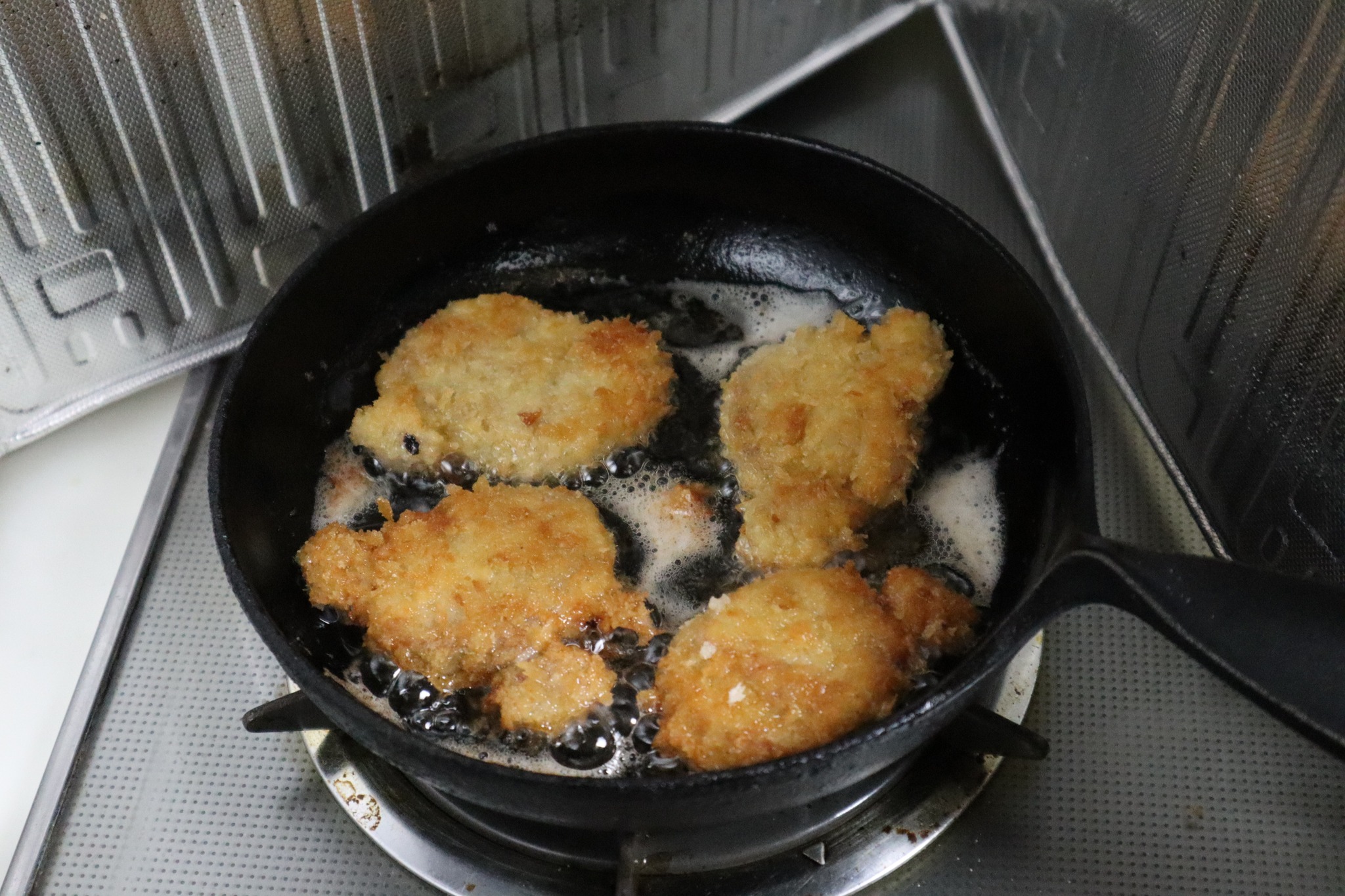 いつも使っている南部鉄器のフライパンは肉厚が約4mm位の厚さが有り、鋳鉄は蓄熱性に優れているので、素人でも温度が下がりづらいのでカラット揚がります。