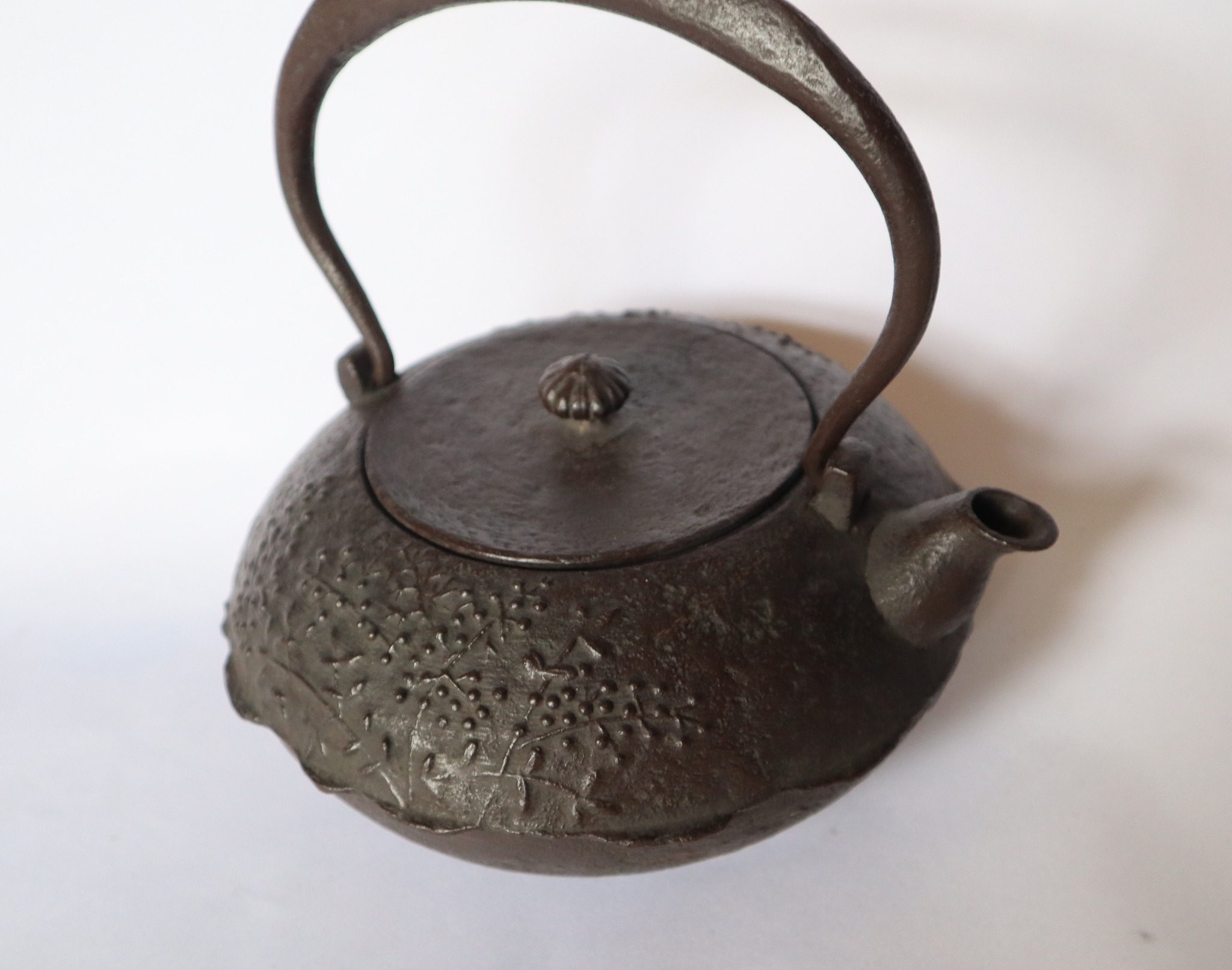及鉄鋳造所宝鉄堂の南部鉄器。鉄瓶は日展作家で伝統工芸士の及川栄喜のてによって作られ、古来からの焼型製法で作る南部鉄器・鉄瓶に魅力を感じ、自分の感性を鉄器に表現します。