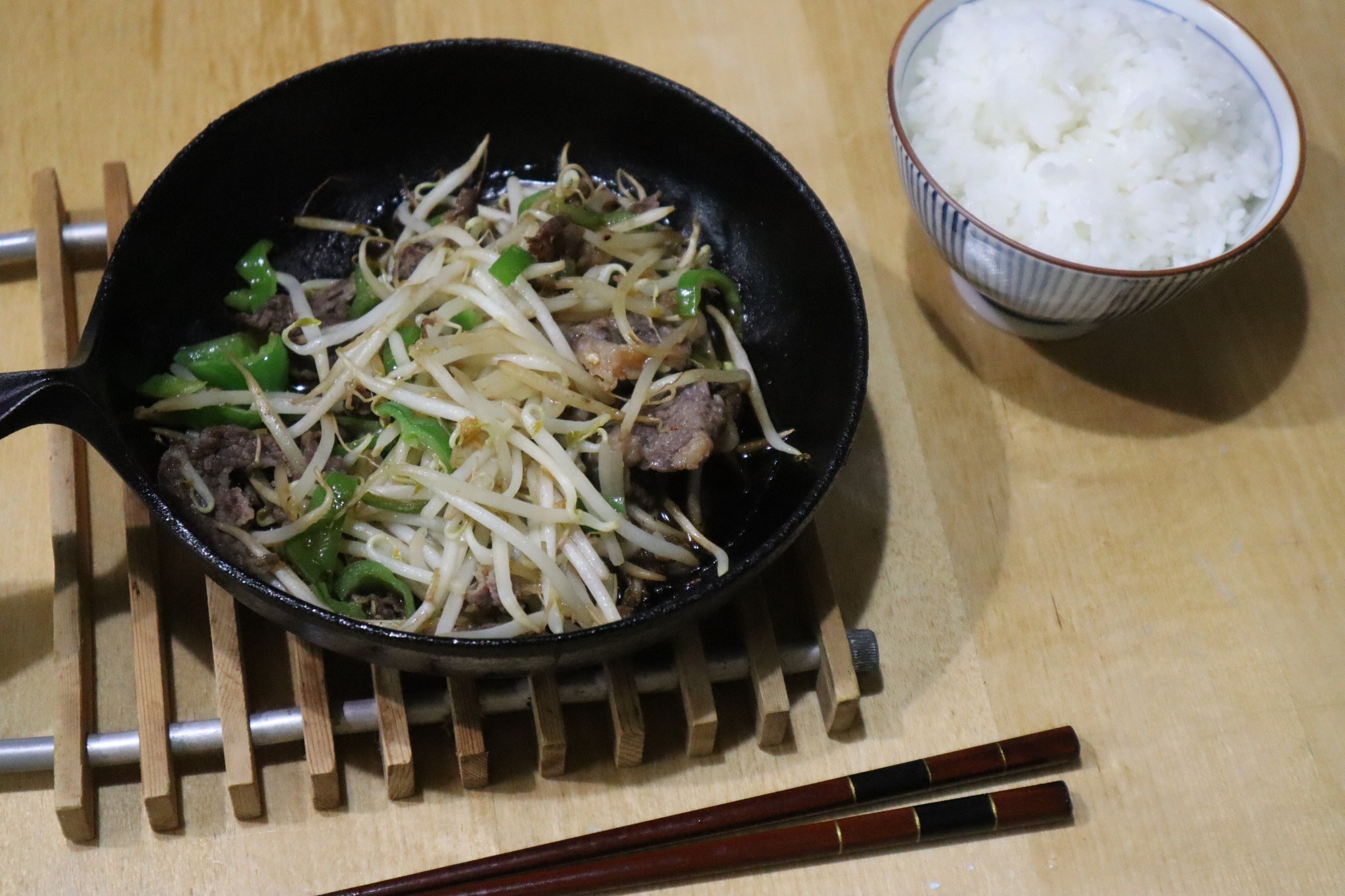 私一人の夕食の時は楽に夕食を済まる時は、南部鉄器のフライパンに重宝し、今日の夕食は冷蔵庫にある、牛肉ともやしとピーマンを使って野菜炒めを作りました。
